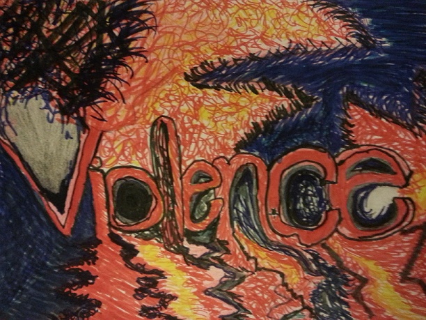 The first is a picture of Violence, this is my interpretation of what colors come to mind when I think of violence. Red for blood spilled, black for death, blue for despair. The rest is just on fire. I want to do a few more words themes, I want to follow up with Peace and Love.